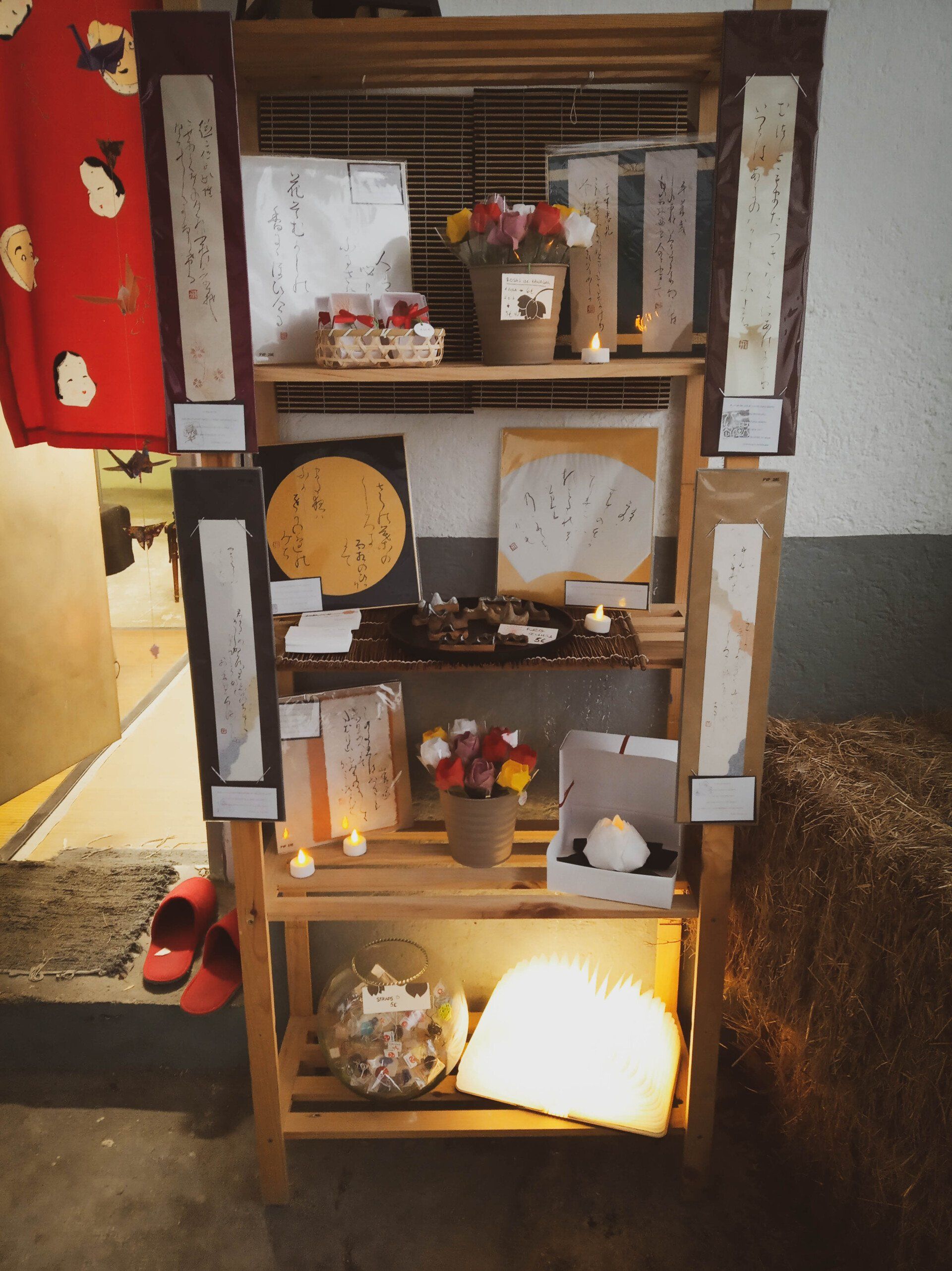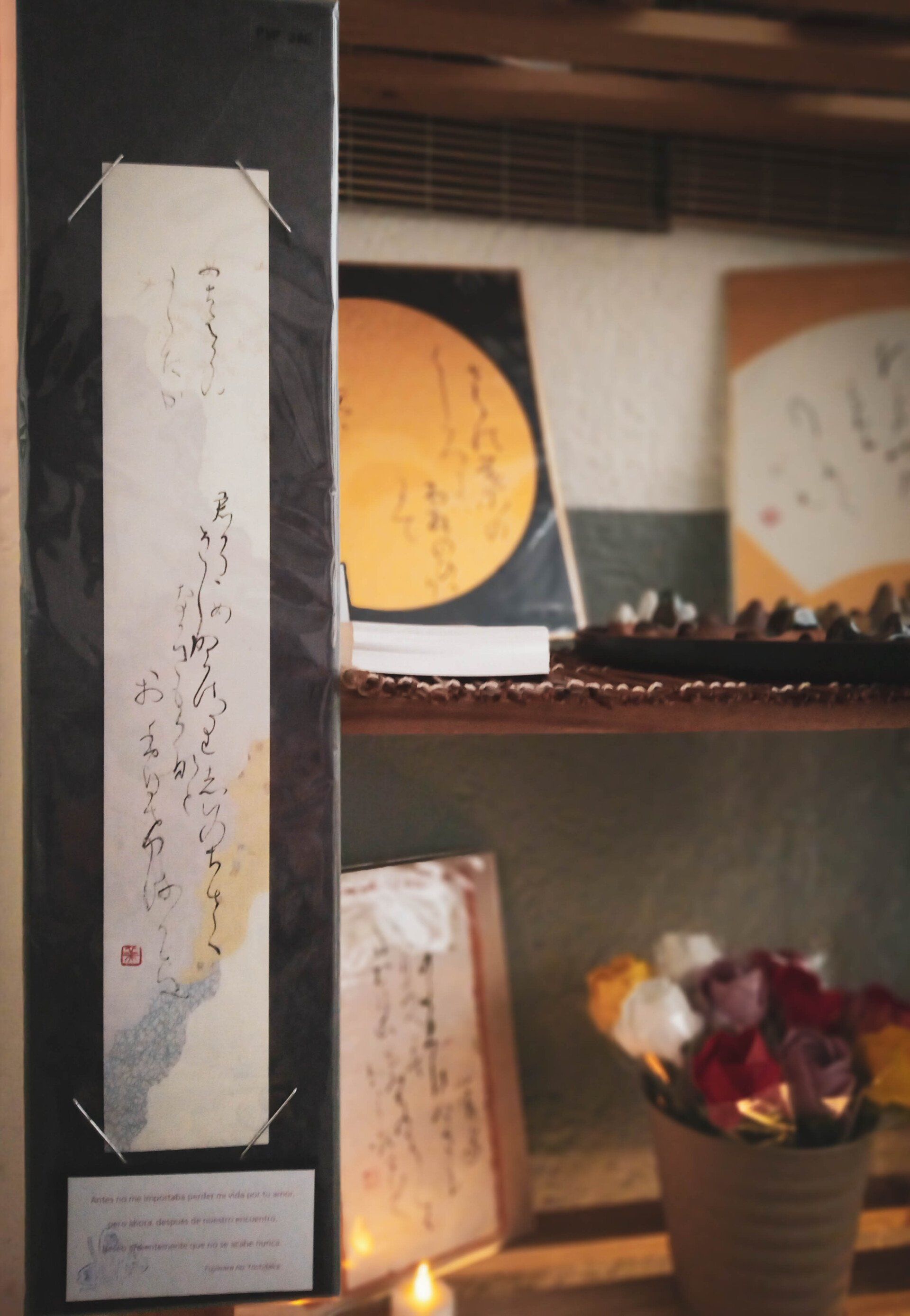Aquí podrás encontrar mascarillas y carteritas confeccionadas con sedas antiguas japonesas, caligrafías de poemas antiguos japoneses presentados en formatos tradicionales como son el tanzaku y el shikishi, pendientes y tocados para el pelo hechos con motivos en origami y mizuhiki... y otras muchas cositas más!!!