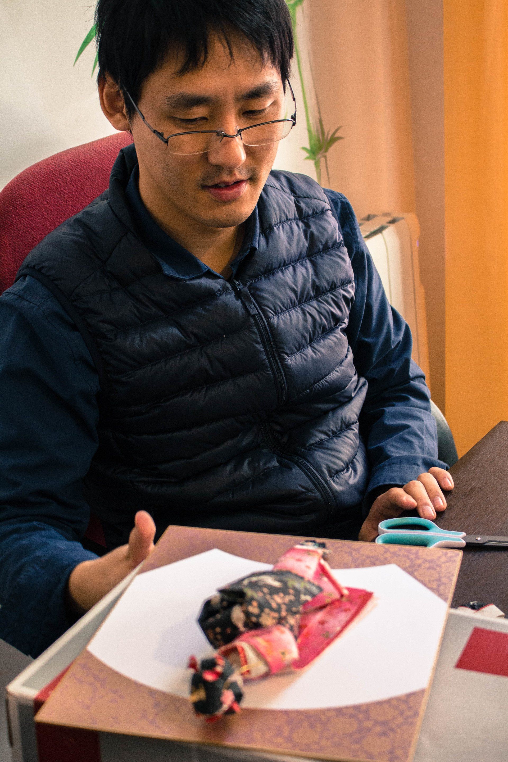 Akio "Peccha" Maruyama 晃生"ぺっちゃ"丸山 (Hamaotsu, 1984, Japan) made his first paper doll, "washi ningyou", thanks to his teacher, his mother, who from a very young age immersed him in this traditional Japanese art, which is rarely known in Western countries. Since 2007 he has dedicated himself professionally to the study, creation and teaching of the different types of paper dolls present in Japanese tradition: geisha, maiko (geisha apprentice), different characters from Kabuki theatre, samurai, hanayome (Japanese bride), oirán (Japanese courtesan), among many other variations.