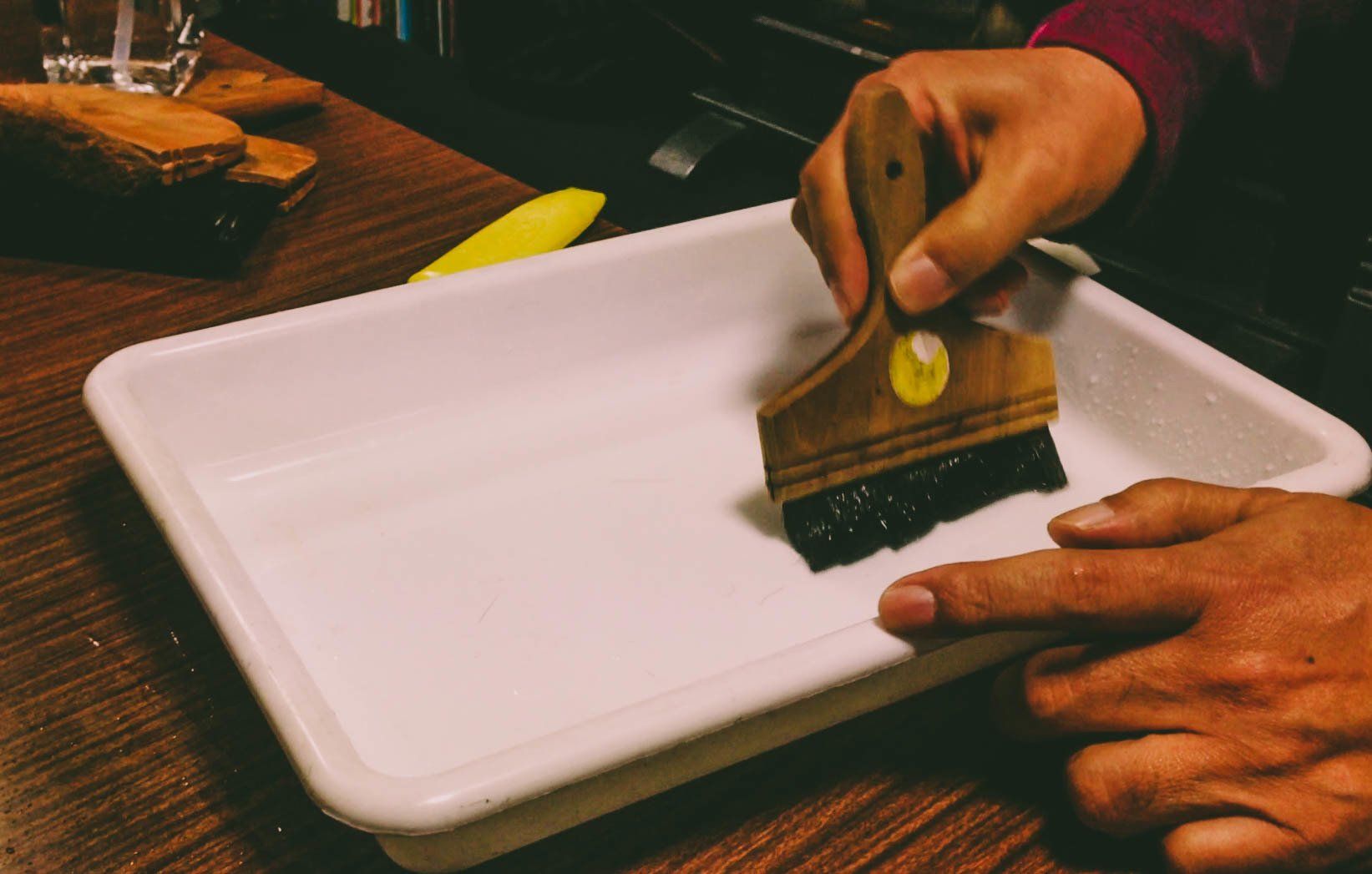On the last day we began the practice by resuming the work from the previous day, but after a short time of practicing, the master saw it necessary to show how to give the paste treatment to the pieces, called urauchi 裏打ち.