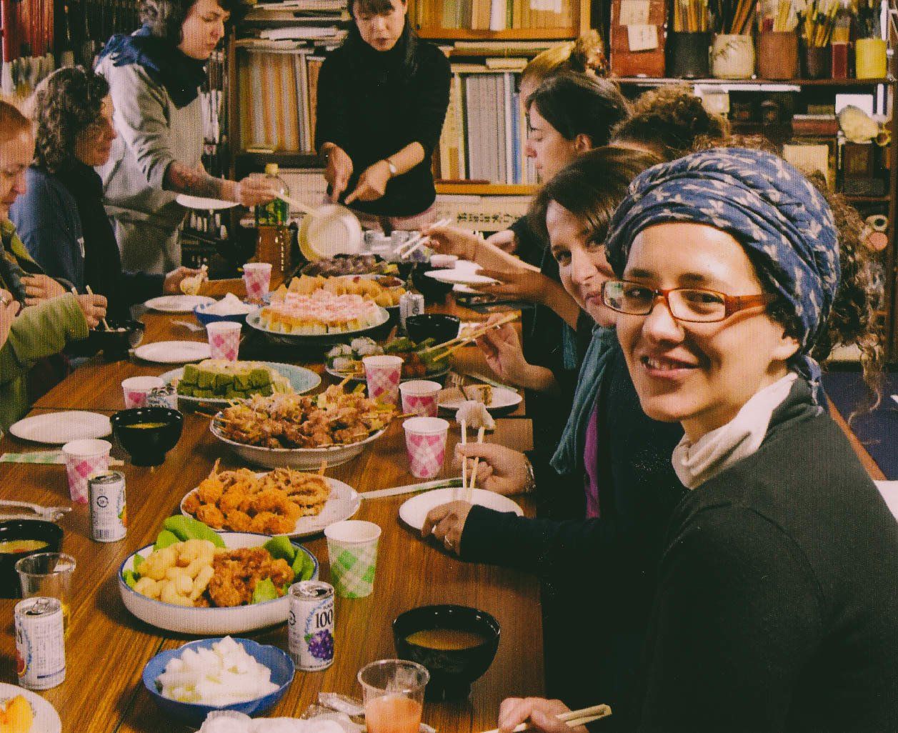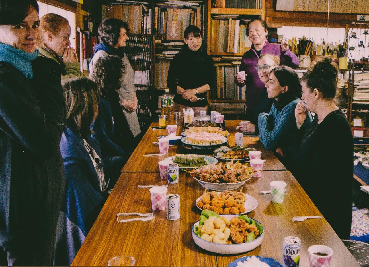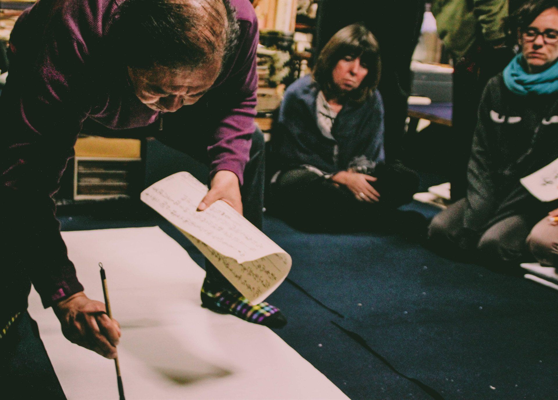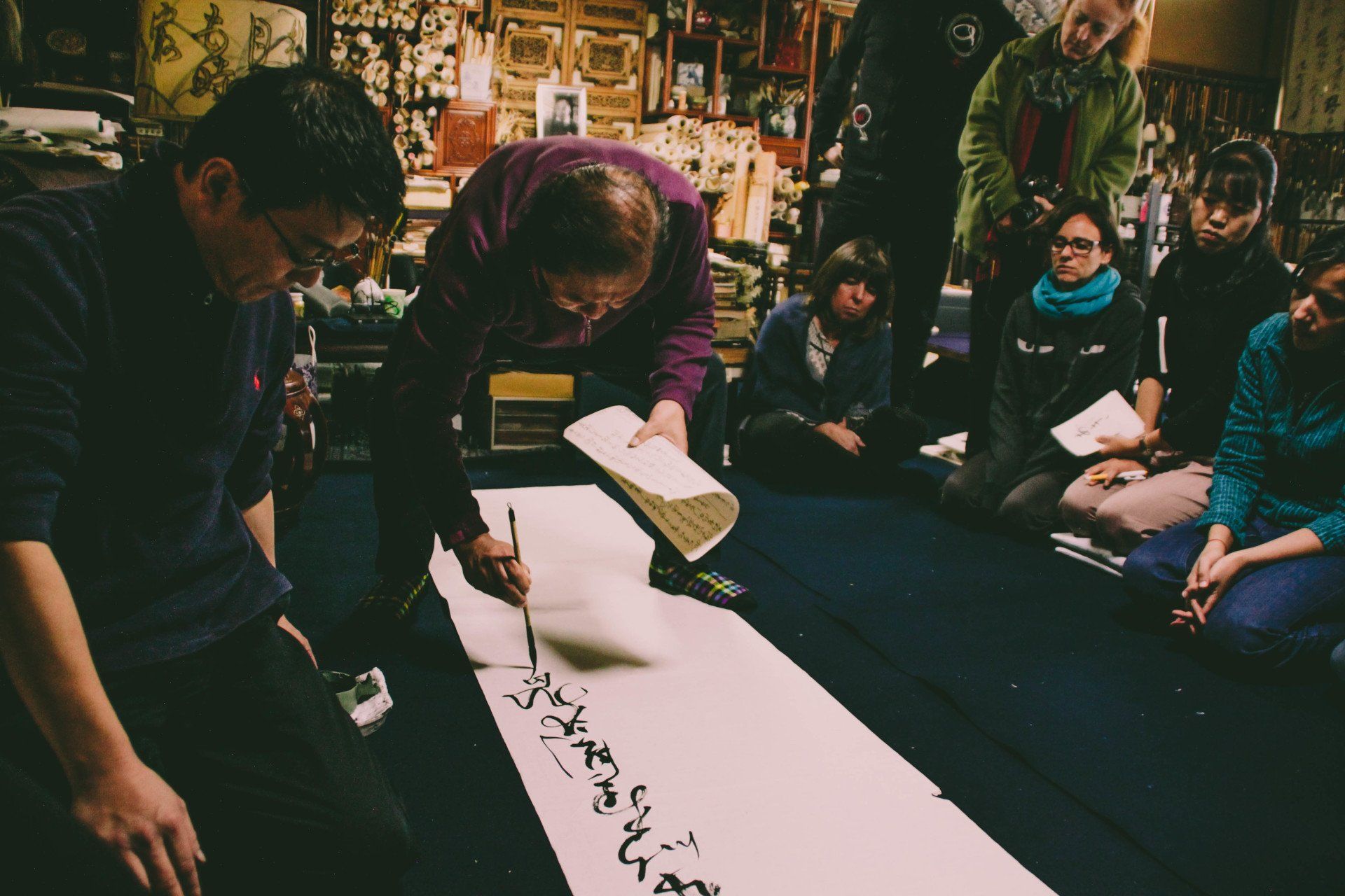 The best was yet to come. Nakamura-san was busy preparing some long, large papers on the carpeted floor, while Akiko was translating what the master was telling us. He insisted that we not forget that his main occupation was not teaching, but being a calligrapher, and so he wanted to honor us with a live demonstration of a transcription of an ancient Chinese poem calligraphed by him, something that brought more than one tear of emotion. I must say that it was such a crucial moment for me, that just seeing him and feeling his breathing to the sound of his expressive brushstrokes, made me truly understand why I wanted to dedicate myself body and soul to the practice, and that it had to be with him. For this moment alone I will be eternally grateful.