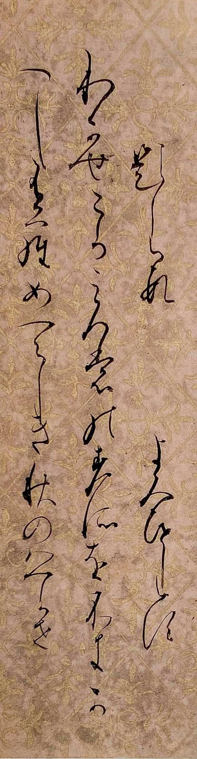 Practicing kana calligraphy shows us the richness of a very vast world: rich because of the beauty of the handmade papers that emerged specifically for this work, the use of specific sizes of supports such as tanzaku 短冊 or shikishi 色紙, because of the new techniques of taking fine brush strokes and because of the appearance of new forms of writing composition. I will talk about all of this in detail in other sections. Kana is an elegant, delicate and subtle style of calligraphy that flows across the paper, whether on pure white or in contrast with saturated and ornamental colours. In its layout, continuous and discontinuous lines can be observed, just like the transparent thread of incense smoke that rises through the air. It is a style that moves us and that captures us when we observe it, and even more so if we practice it. Text written by Elena Hikari and Carla Padín.