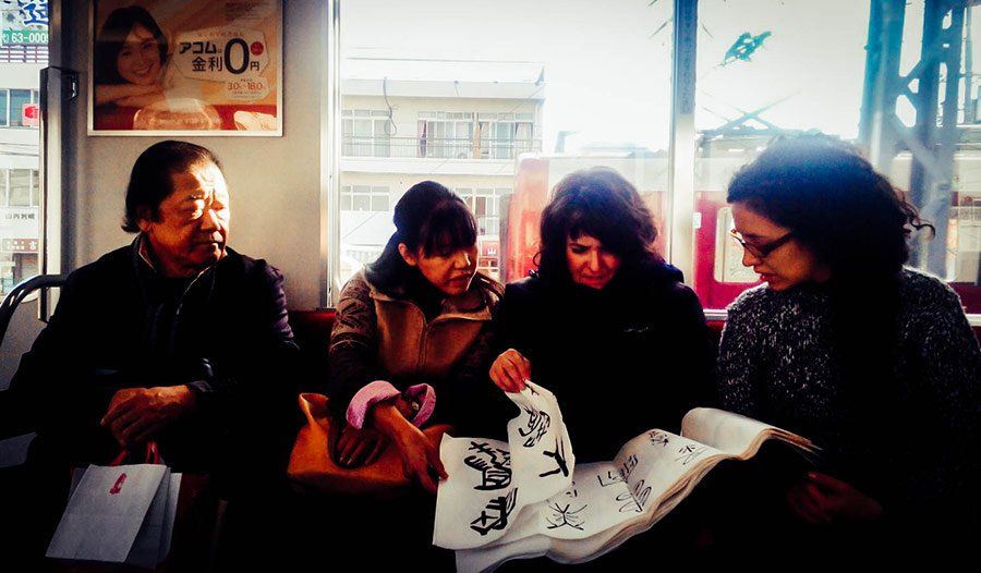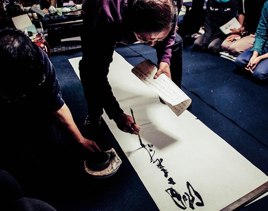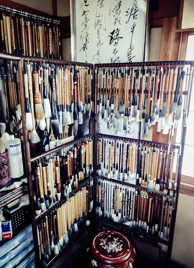 Un día de Momiji, en su estudio abigarrado de pinceles, papeles de fibras vegetales, colecciones de suzuri(s) y pinturas sobre kakejiku(s), nos ofreció una demostración de caligrafía en gran formato, utilizando como excusa un antiguo poema chino. Su asistente y aventajado alumno, Nakamura-san, le ayudó con total respeto y generosidad a organizar los materiales de trabajo. Este momento de absoluta belleza (el cual compartimos con todos vosotros en nuestras redes sociales a través de un vídeo) significó para nosotros una experiencia invaluable, trascendente y nos movilizó hasta las lágrimas.