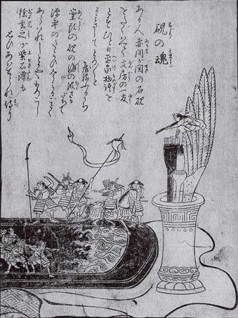 En la imagen puede verse un yokai (espíritus o demonio pertenecientes al folclore japonés) llamado Suzuri no Sei 硯の精, que se traduce literalmente como "El espíritu del Suzuri". Este se encuentra en una escena de guerra entre samuráis dentro de un Suzuri que, a modo de barco, sostiene la escena, la cual está acompañada de una caligrafía.
