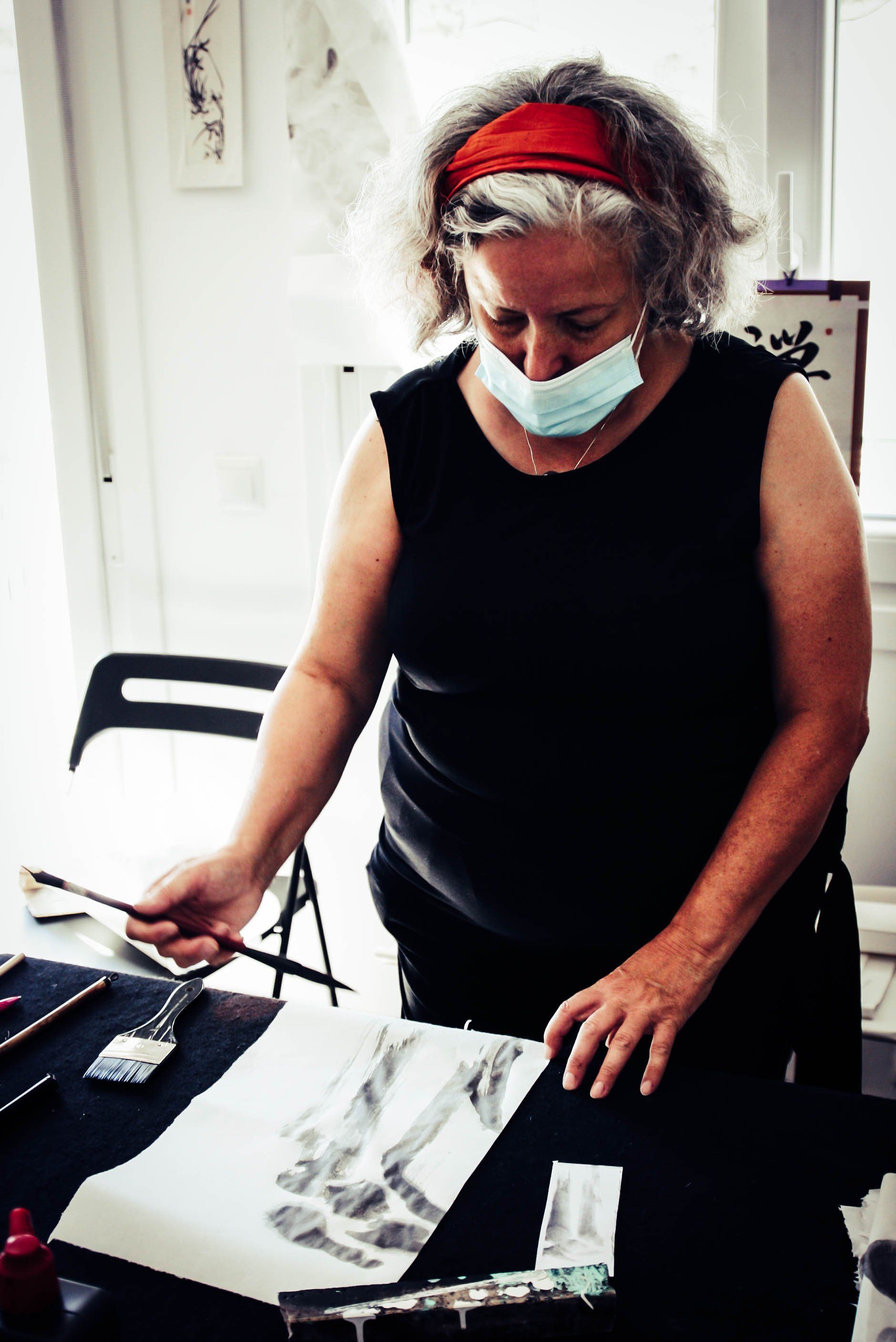 una introducción teórica y proyección de imágenes, y contamos con la presencia de personas que asistieron de Costa Rica, México, Mataró, Segovia y de las afueras de Madrid; y el sábado nos juntamos a pintar y a mancharnos las manos y los codos con tinta china de verdad para hacer emerger las cascadas desde el fondo del papel.