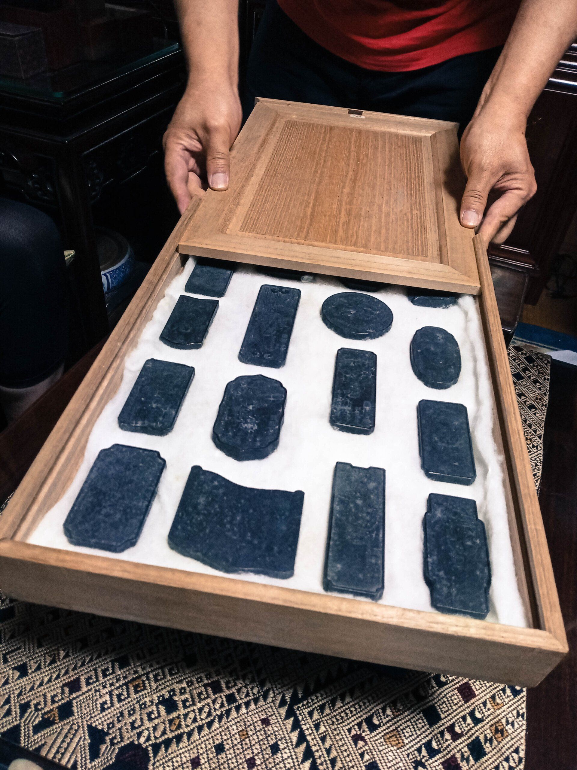 Yes, it is black and matte, but it has nuances. These nuances also depend - to a large extent - on the type of wood used to make the soot as well as the paper on which it is used. The ink is made with very fine grains of soot (usually from pine wood), binder (usually from fish glue scales or animal horns and bones) and various flavorings such as white sandalwood or camphor. And depending on their recipes, many of which take their elements from traditional Chinese medicine, some inks turn red, others turn blue and others have "little sparkles" when viewed flush with the paper.