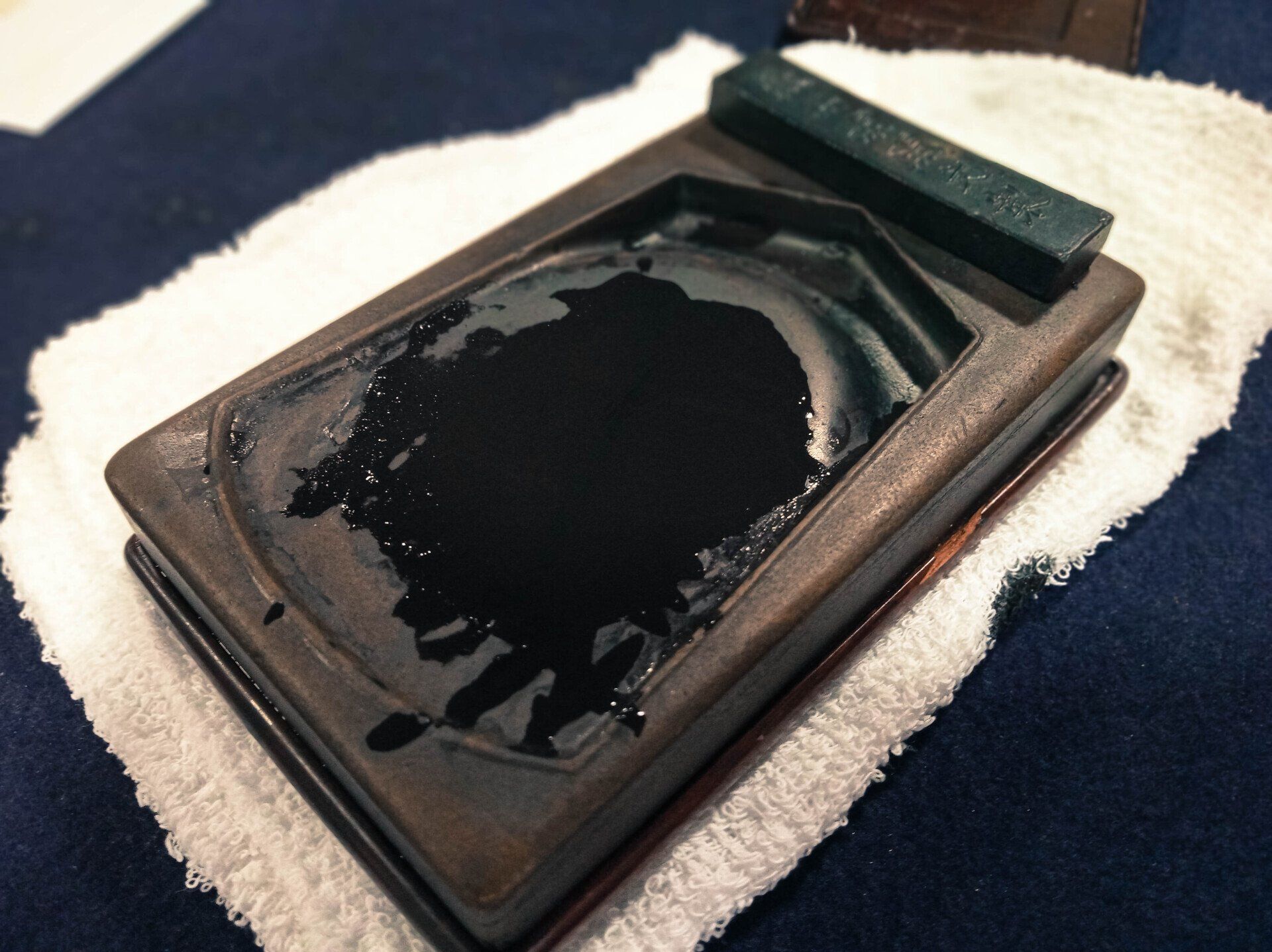 The ink used for Japanese, Chinese and Korean painting and calligraphy is made of organic material, and is presented in a block that must be rubbed on a stone called suzuri 硯 to grind it with water for about twenty minutes to an hour.